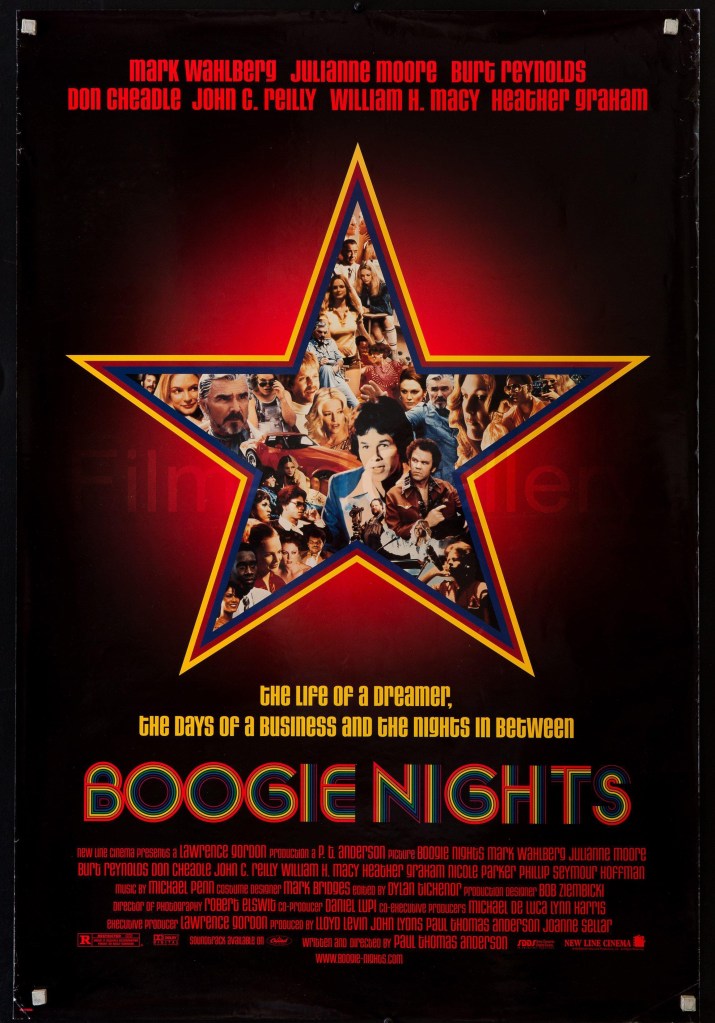 The cast includes of course Mark Wahlberg in the lead role as Dirk Diggler, with all-star support from Burt Reynolds, Julianne Moore, Heather Graham, John C. Reilly, Don Cheadle, William H. Macy, Phillip Seymour Hoffman, Luis Guzmán, and it features many real-live adult film stars, which is a nice touch, but wholly unnecessary. The cast works well together and performs with great stamina over the 156 minute runtime. The acting is superb across the board, especially at the climax. However, one might argue there are multiple climaxes seen on-screen.